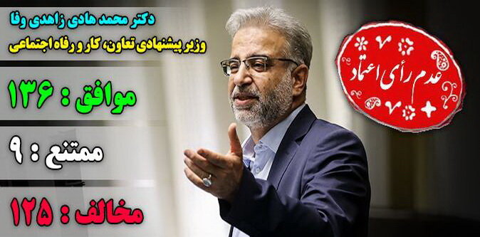 در نهایت دکتر محمدباقر قالیباف رئیس مجلس شورای اسلامی در این نشست نتیجه رأی اعتماد به وزیر پیشنهادی را قرائت کرد که براساس آن نمایندگان مجلس با ۱۳۶ رأی موافق، ۱۲۵ رأی مخالف و ۹ رأی ممتنع از مجموع ۲۷۲ آرای مأخوذه، با تصدی وزارتخانه تعاون، کار و رفاه اجتماعی توسط زاهدی وفا مخالفت کردند.