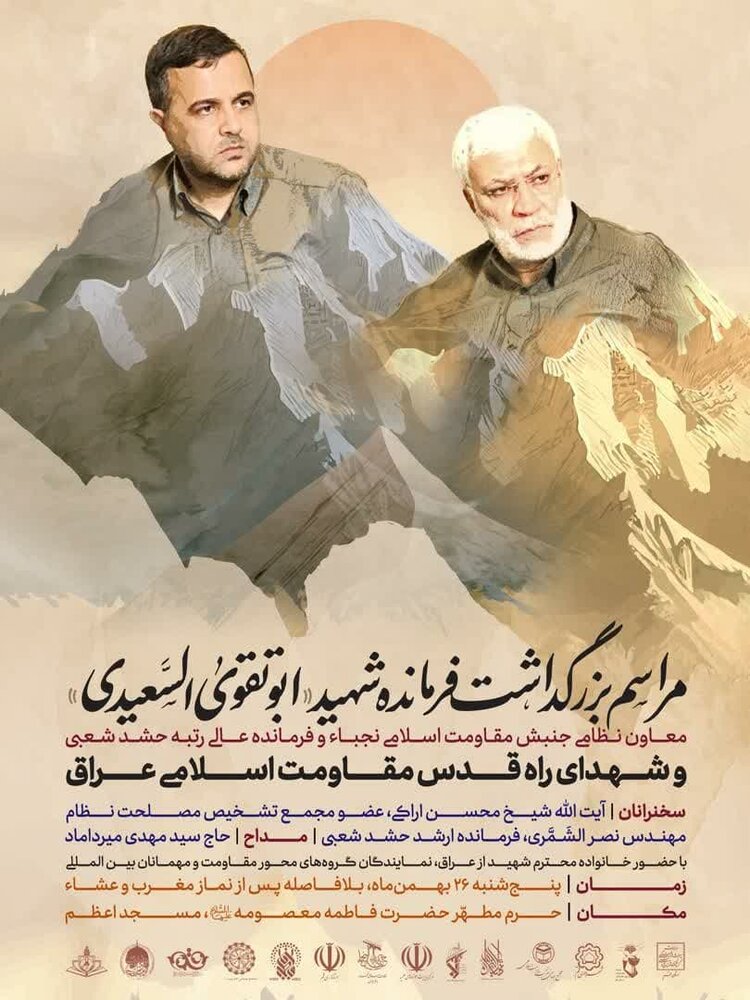 به گزارش خبرگزاری حوزه، مراسم بزرگداشت شهید ابوتقوا السعیدی معاون نظامی مقاومت اسلامی نُجَباء و فرمانده عالیرتبه الحشد الشعبی و شهدای راه قدس مقاومت اسلامی عراق روز پنجشنبه ۲۶ بهمنماه همراه با نماز مغرب و عشاء در مسجد اعظم حرم مطهر حضرت فاطمه معصومه(س) برگزار میشود.