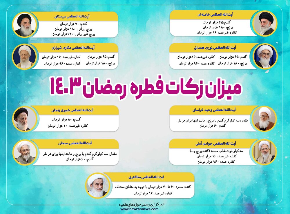 امسال هم میزان زکات فطریه هر نفر طبق نظر مراجع عظام تقلید حضرات آیات خامنهای، سیستانی، وحیدخراسانی، مکارم شیرازی، نوری همدانی، شبیری زنجانی، سبحانی، جوادی آملی و مظاهری بر مبنای قوت غالب گندم و برنج اعلام شد.