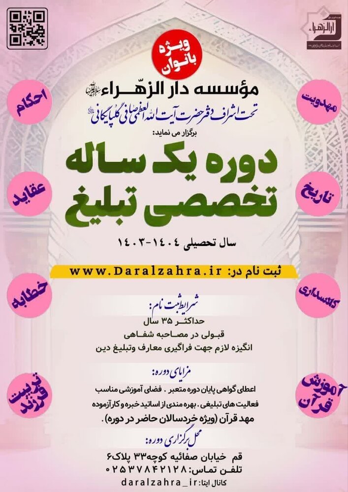 حوزه/ دوره تخصصی تربیت مبلغه با موضوعات متنوع و کاربردی تبلیغی تکمیل ظرفیت ویژه خواهران, باحضور اساتید برجسته و اعطای مدرک معتبر برگزار می شود.
