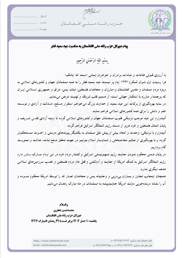 به گزارش سرویس بین الملل خبرگزاری «حوزه»، محمدحسن جعفری، دبیرکل حزب رفاه ملی افغانستان، در پیامی به مناسبت عید سعید فطر، این ایام پربرکت را به مسلمانان جهان و به ویژه مردم افغانستان و مبارزان فلسطین، لبنان، یمن، عراق و ایران تبریک گفت. وی در این پیام، از خداوند خواستار استقرار صلح، عدالت و توسعه در کشورهای اسلامی شد و بر اهمیت وحدت مسلمانان برای آزادی قدس شریف و پایان اشغال فلسطین تأکید کرد.