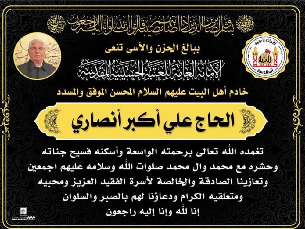 به گزارش خبرگزاری حوزه، در پی درگذشت خادم الحسین (ع) مرحوم حاج علی اکبر انصاری اعتاب مقدس عراق در اطلاعیه هایی درگذشت این واقف فرش های حرم های مطهر را تسلیت گفتند.