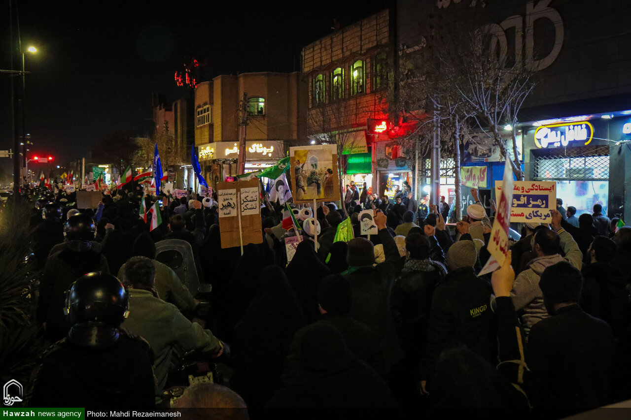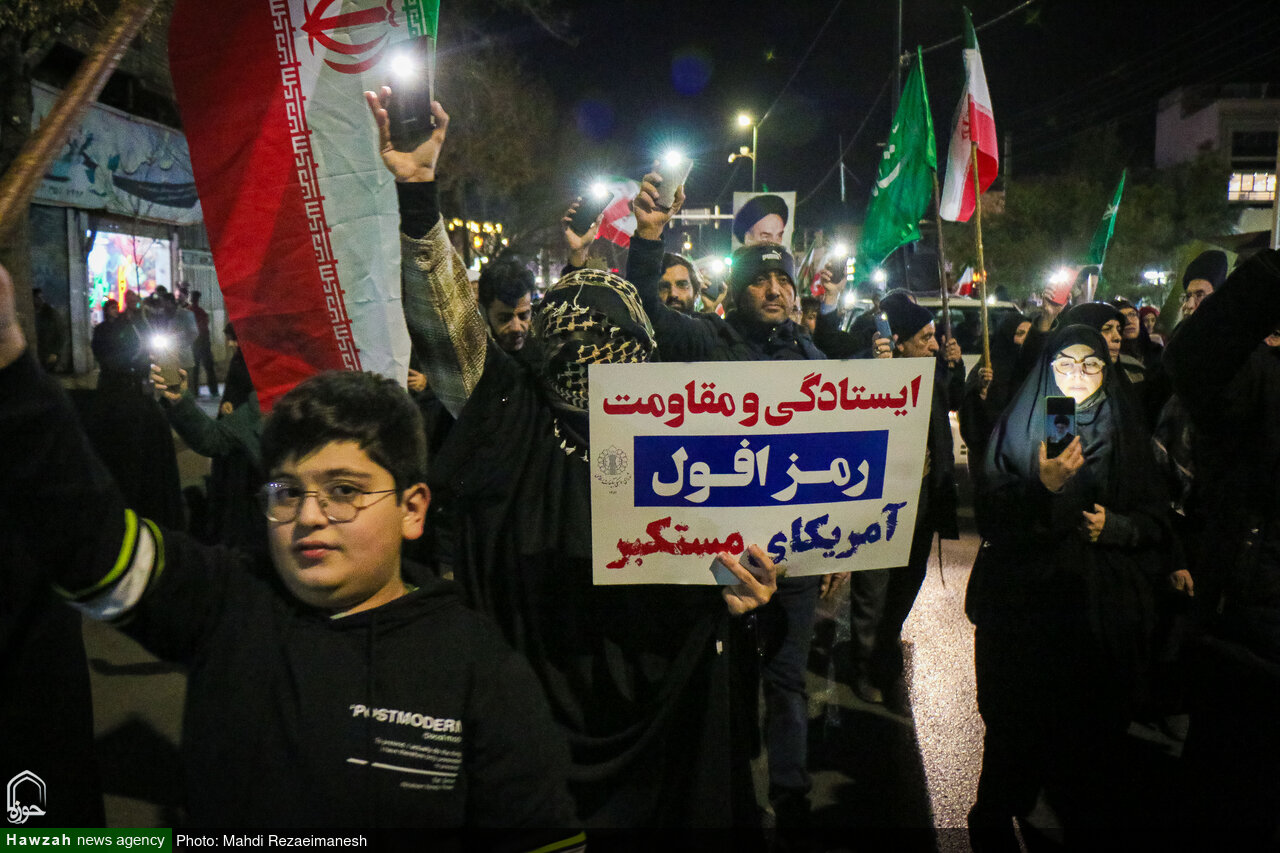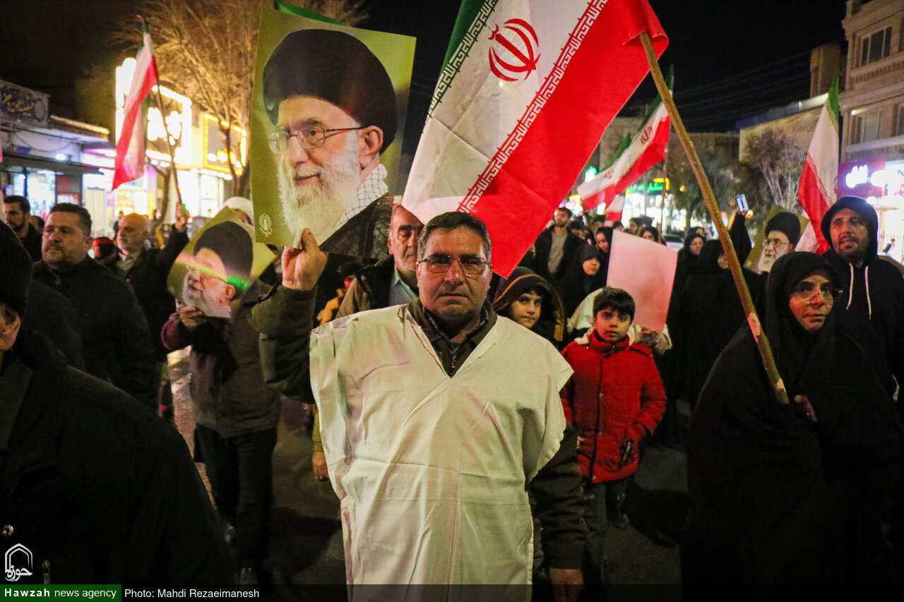 به گزارش خبرگزاری حوزه، مردم انقلابی، ولایت مدار و وفادار قم در سومین شب حضور خودجوش خود برای محکومیت جنایات اغتشاشگران و آشوبگران فریب‌خورده رژیم صهیونیستی، کفن‌پوش به خیابان‌ آمدند تا به ترامپ جنایتکار و مزدورانش بگویند برای حفظ انقلاب و آرمان های شهدای عزیز حاضرند جان خود را فدا کنند.