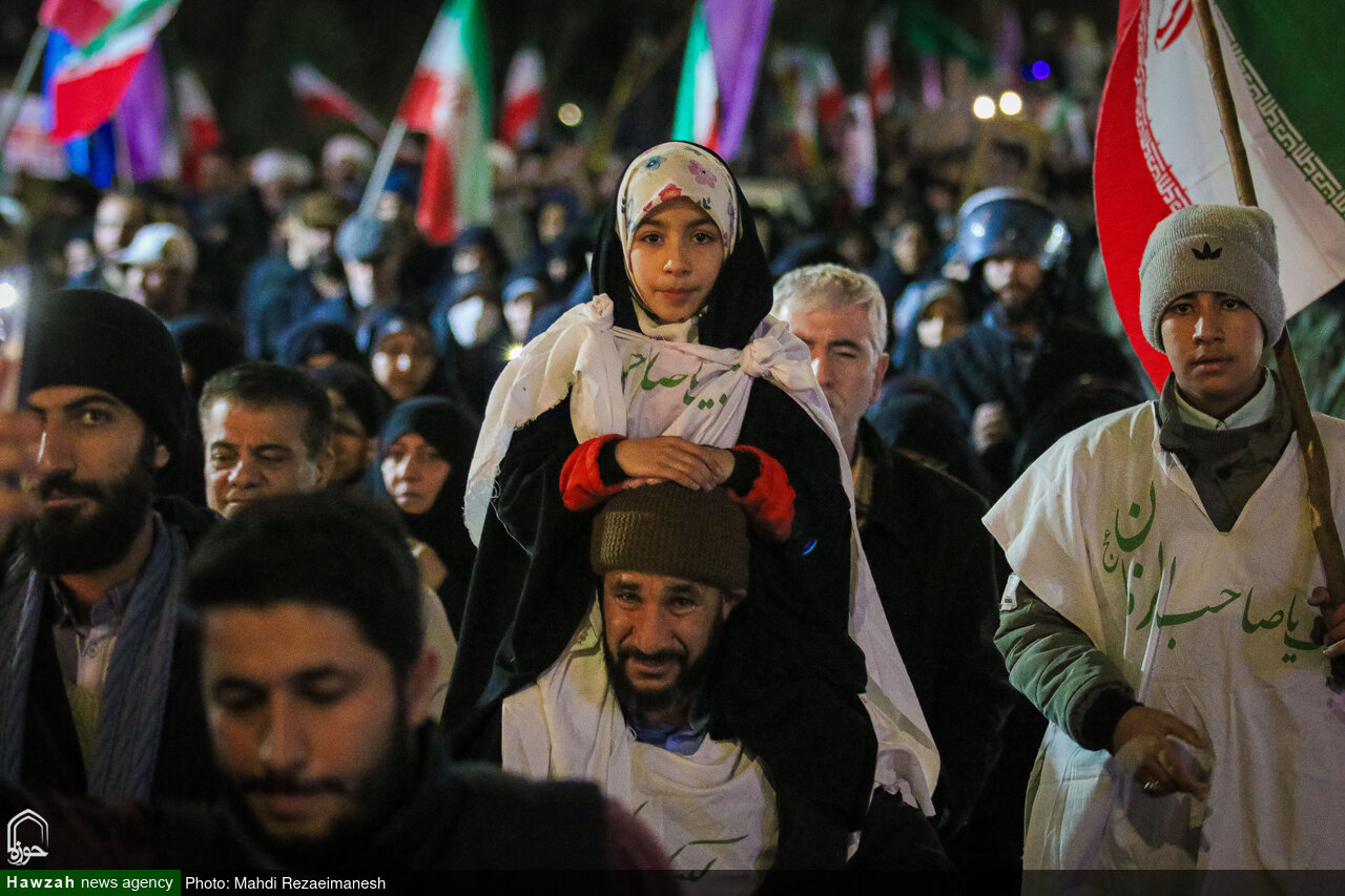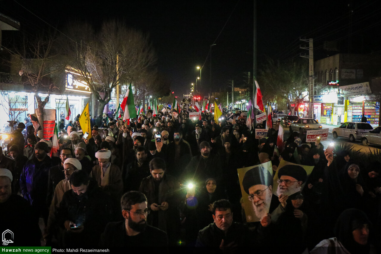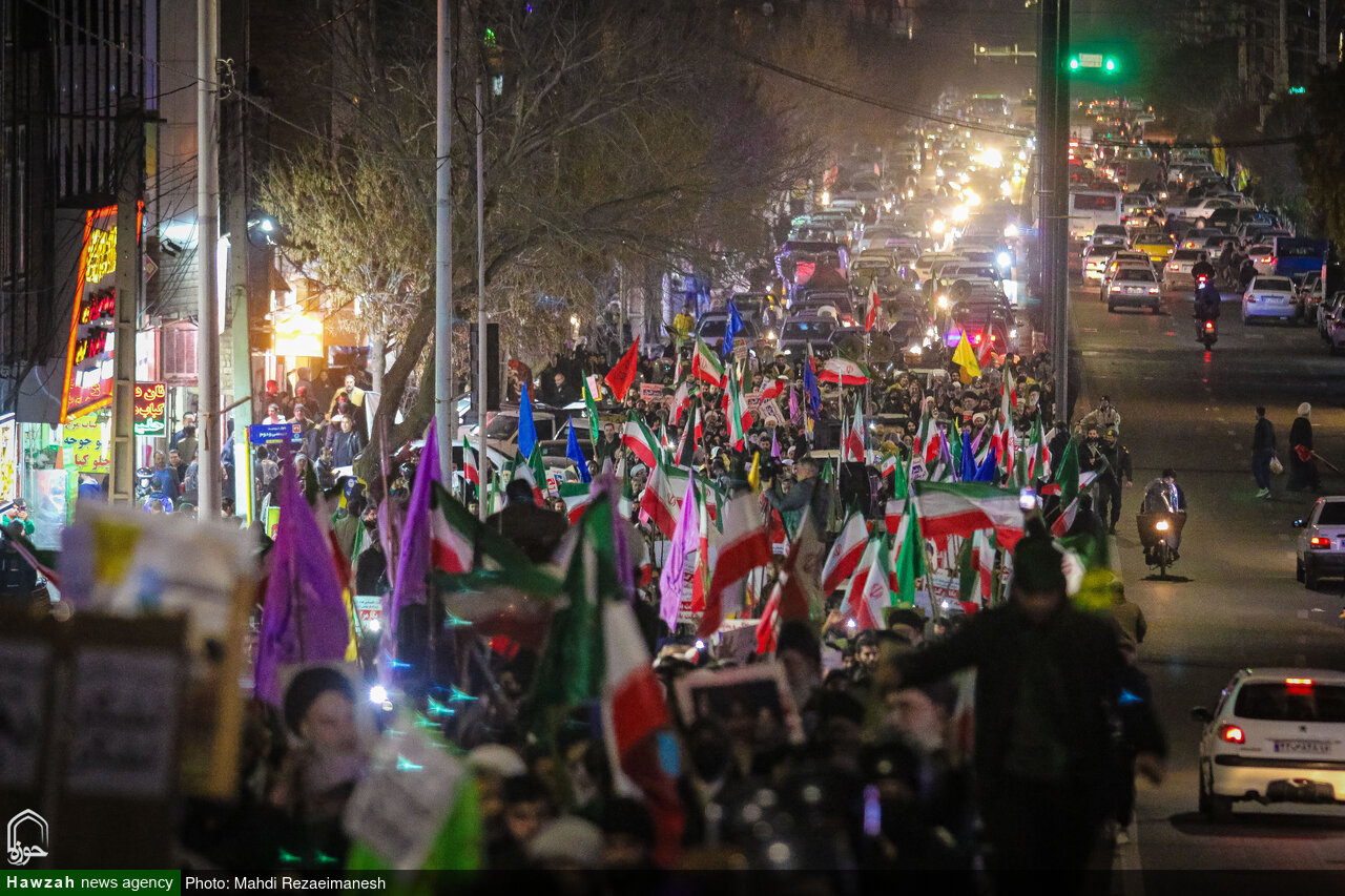 به گزارش خبرگزاری حوزه، مردم انقلابی، ولایت مدار و وفادار قم در سومین شب حضور خودجوش خود برای محکومیت جنایات اغتشاشگران و آشوبگران فریب‌خورده رژیم صهیونیستی، کفن‌پوش به خیابان‌ آمدند تا به ترامپ جنایتکار و مزدورانش بگویند برای حفظ انقلاب و آرمان های شهدای عزیز حاضرند جان خود را فدا کنند.