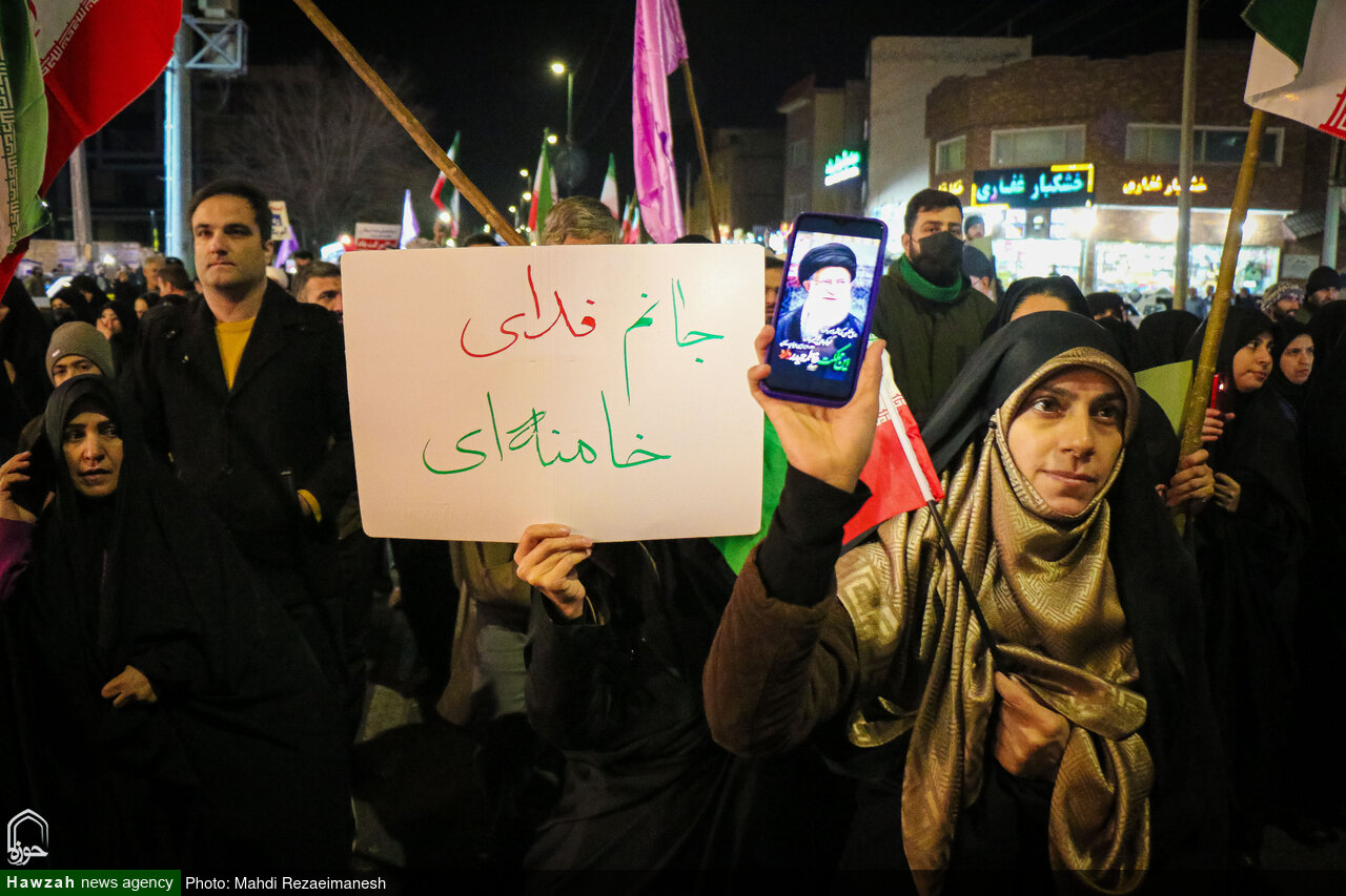 مردم خاستگاه انقلاب اسلامی با اتحاد مقدس، پرچم‌های مقدس جمهوری اسلامی و تصاویر امام خمینی(ره) و مقام معظم رهبری را دست داشتند و از اقدامات خراب‌کارانه و جنایات وحشیانه آشوبگران در کشور اعلام خشم و انزجار کردند.