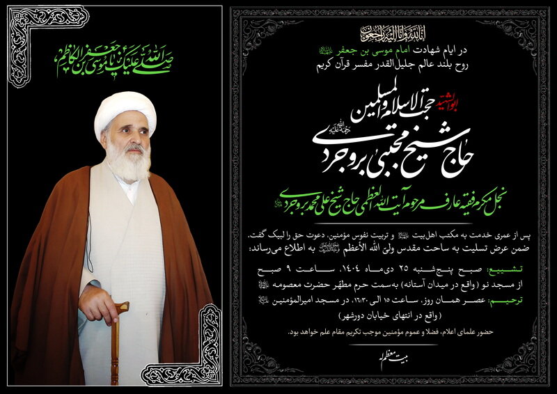 به گزارش خبرگزاری حوزه، ابوالشهید حجت الاسلام والمسلمین مجتبی بروجردی، فرزند عالم ربانی آیت الله شیخ علی محمد بروجردی، برادر شهید آیت الله شیخ مرتضی بروجردی و پدر شهید عیسی بروجردی پس از عمری جهاد علمی و معنوی، در سن ۹۲ سالگی به رحمت ایزدی پیوست.