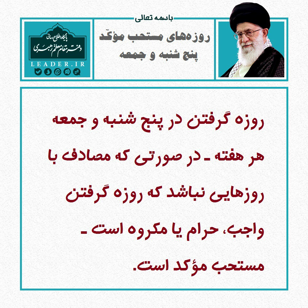 به گزارش خبرگزاری «حوزه»، حضرت آیت الله خامنه ای، رهبر معظم انقلاب اسلامی گرفتن روزه در روزهای پنج شنبه و جمعه را مستحب مؤکّد دانستند که متن سخنان معظم له بدین شرح است: