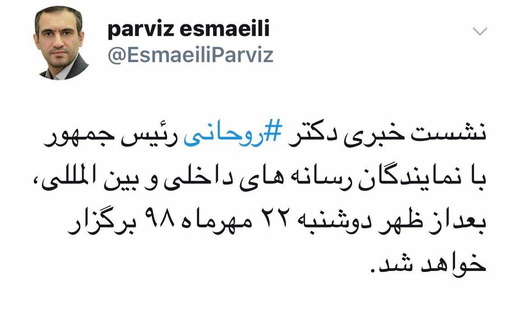 به گزارش خبرگزاری «حوزه» از تهران، پرویز اسماعیلی، معاون ارتباطات دفتر رئیس جمهور در توئیتی نوشت: نشست خبری آقای روحانی رئیس جمهور با نمایندگان رسانههای داخلی و بین المللی بعد از ظهر دوشنبه ۲۲ مهر ماه ۹۸ برگزار خواهد شد.