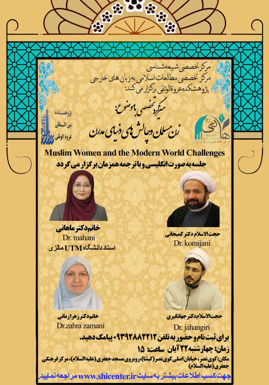حوزه/ میزگرد تخصصی با موضوع «زن مسلمان و چالش های دنیای مدرن» به همت پژوهشکده بین المللی عروة الوثقی و با همکاری مرکز تخصصی شیعه شناسی، در تهران برگزار می شود.