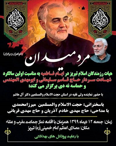 به گزارش خبرگزاری حوزه از تبریز، مراسم گرامیداشت اولین سالگرد شهادت سردار دلها، سپهبد شهید حاج قاسم سلیمانی و ابومهدی المهندس، همزمان با ایام فاطمیه، با رعایت پروتکل های بهداشتی در تبریز برگزار میشود.