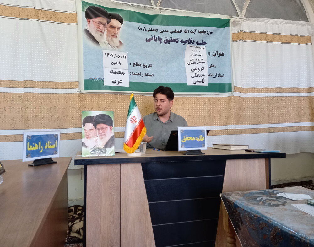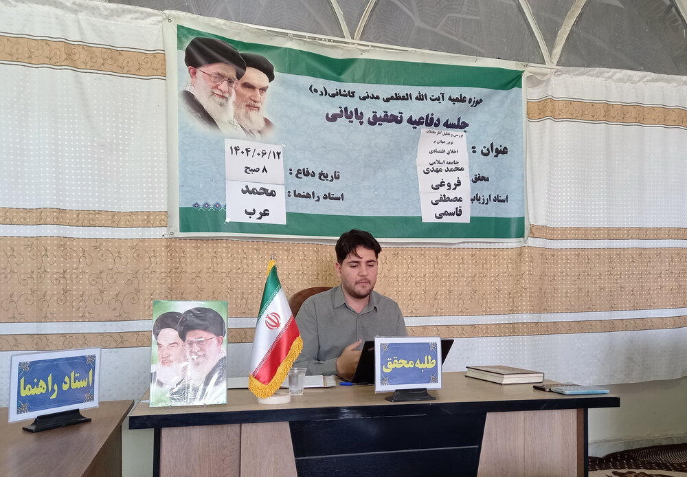 حوزه/ جلسه دفاعیه تحقیق پایانی طلبه محقق مدرسه علمیه آیتالله مدنی کاشانی(ره) روز چهارشنبه با حضور معاون پژوهش این مدرسه، اساتید ارزیاب و راهنما و جمعی از طلاب در پژوهشسرای ملاعبدالرسول مدنی شهرستان کاشان برگزار شد. در این جلسه «محمدمهدی فروغی» از تحقیق پایانی خود با عنوان «بررسی و تحلیل آثار معاملات نوین جهانی بر اخلاق اقتصادی جامعه اسلامی» دفاع کرد.
